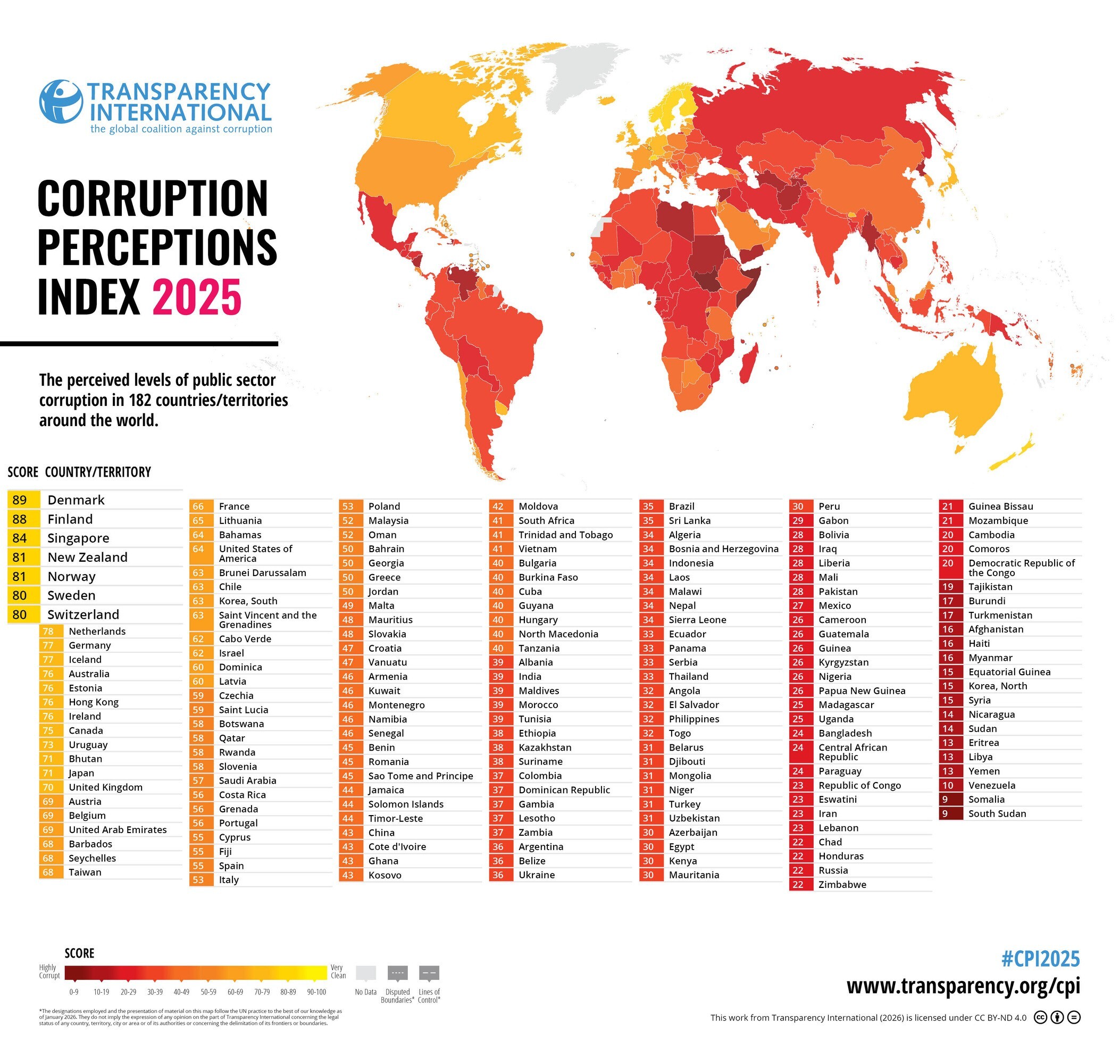 The index scores 180 countries and territories based on expert perceptions of corruption in the form of bribery; diversion of public funds; officials using their public office for private gain without facing consequences; the ability of governments to contain corruption in the public sector; excessive red tape; nepotistic civil service appointments; conflict of interest of public officials; legal protection for whistleblowers, state capture by narrow vested interests, and access to information on public affairs/government activities.